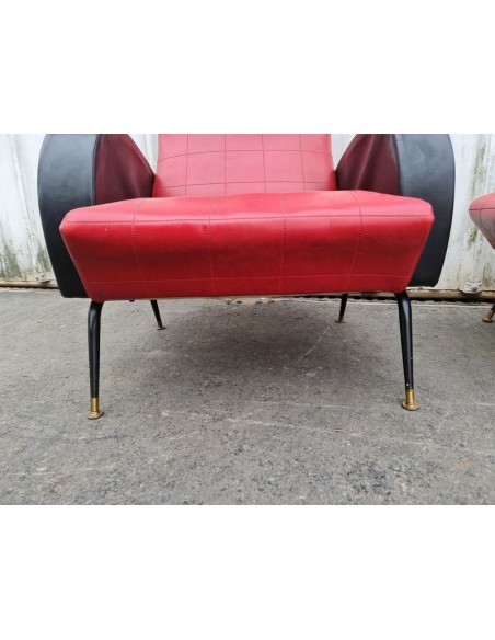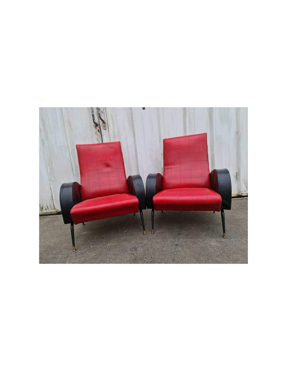 Paire fauteuils design année 60 simili cuir rouge et noir