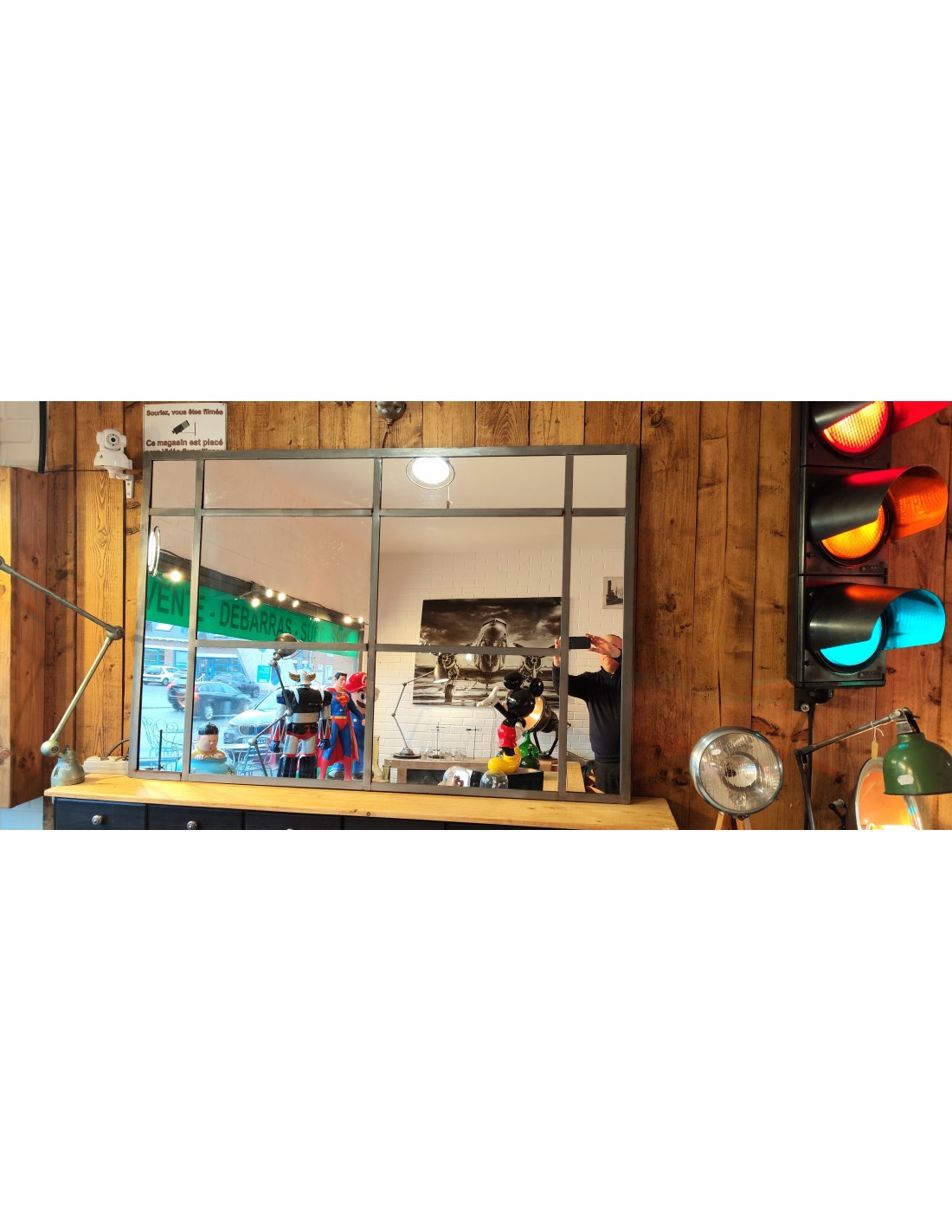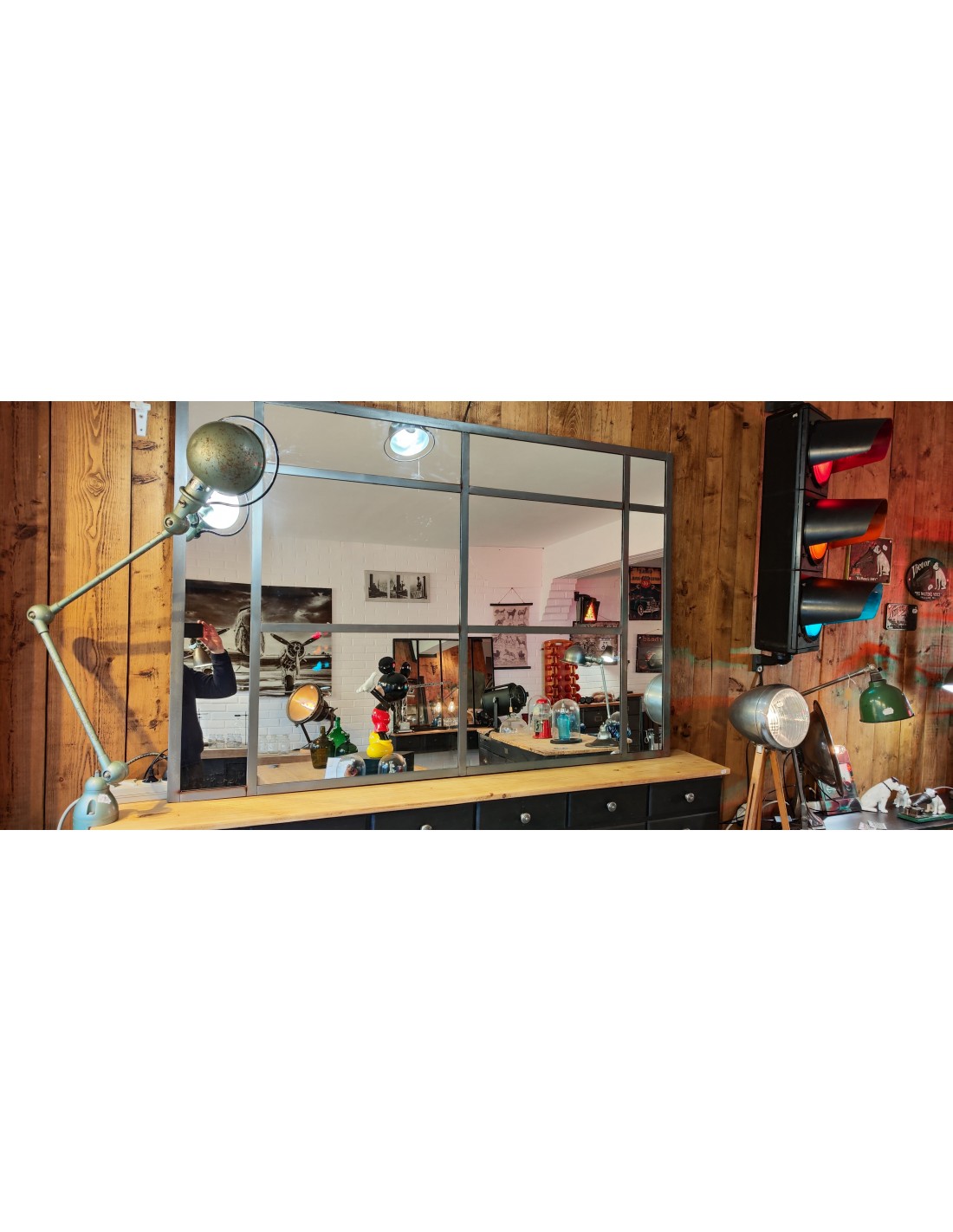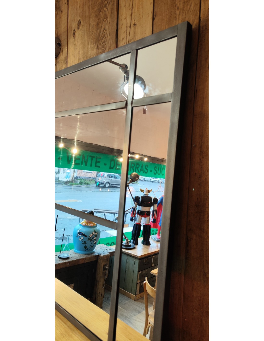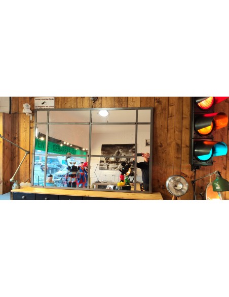 Ancienne verrière d'atelier transformée en miroir industrielTout en métal soudé