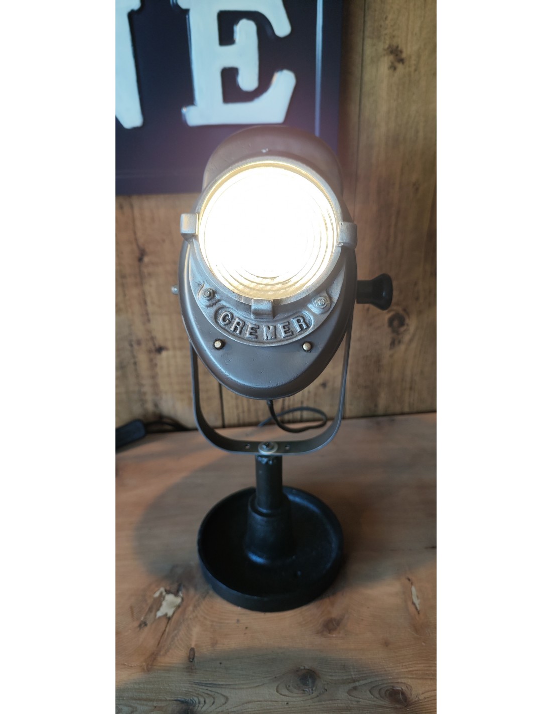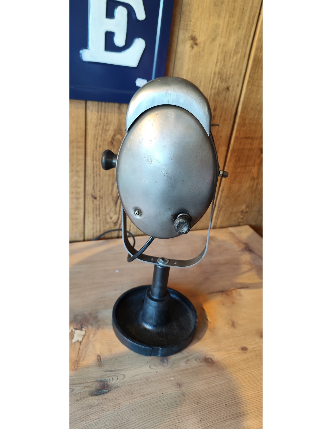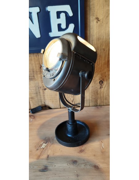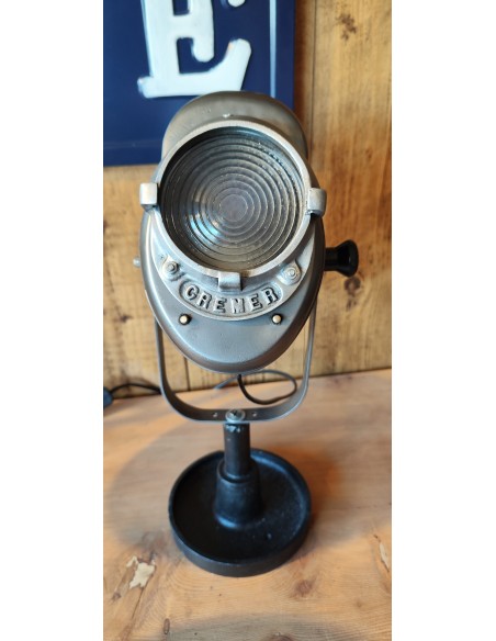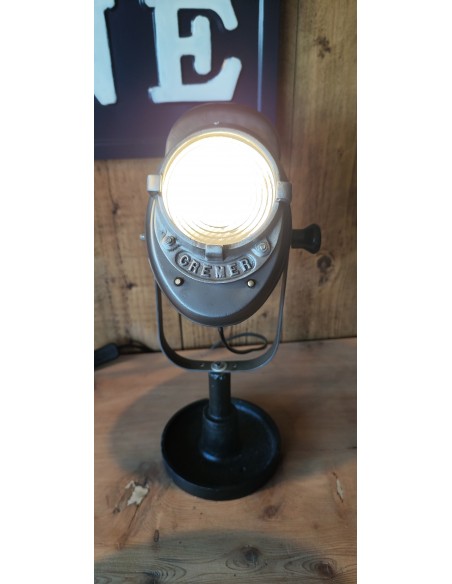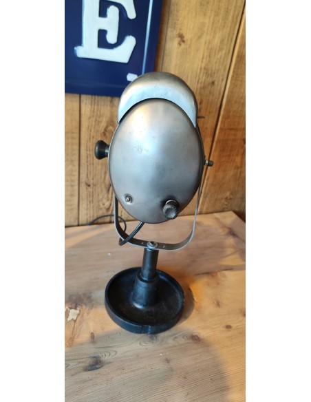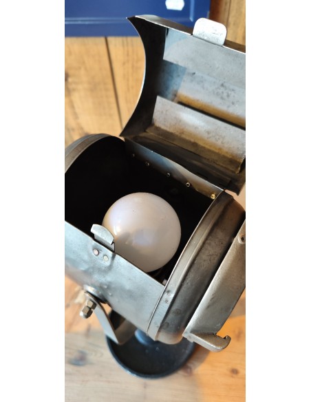 Ancien projecteur Baby Cremer en métal brossé sur pied en fonte