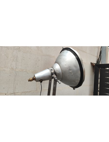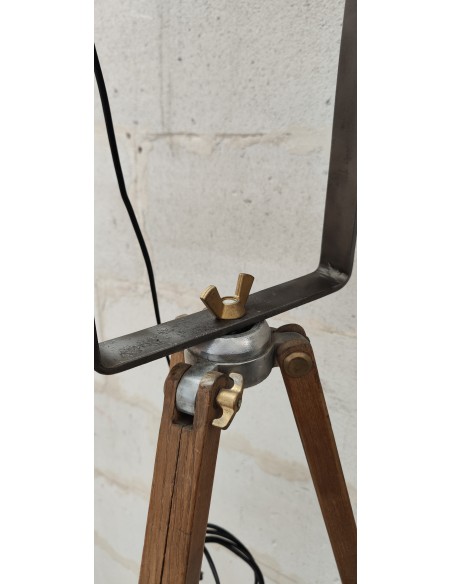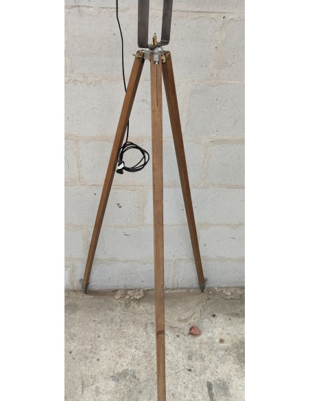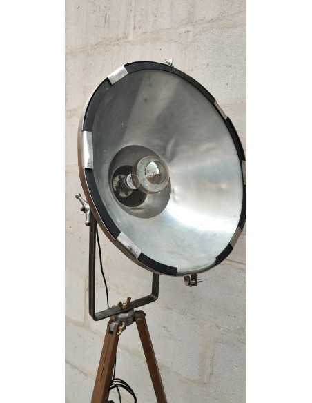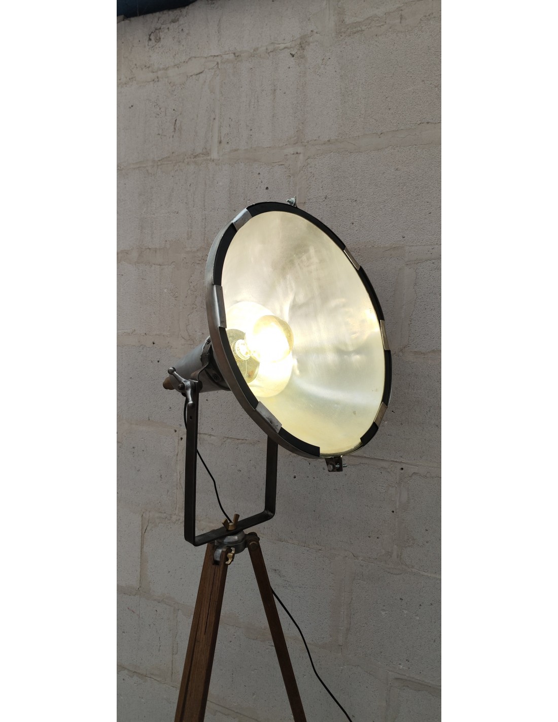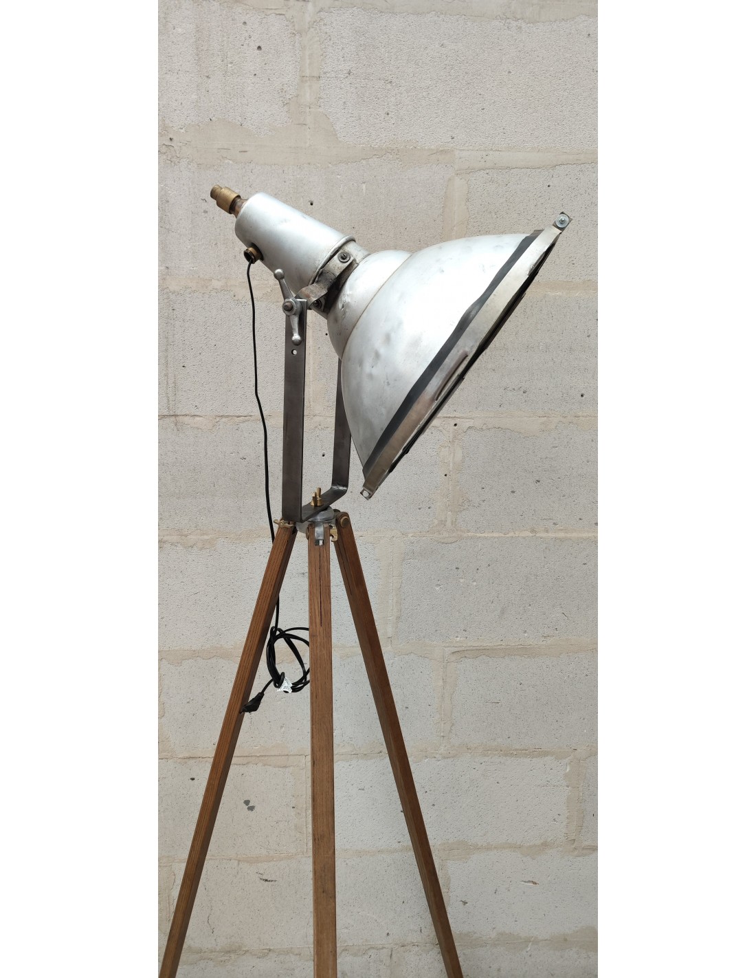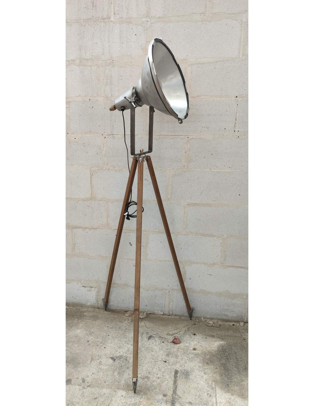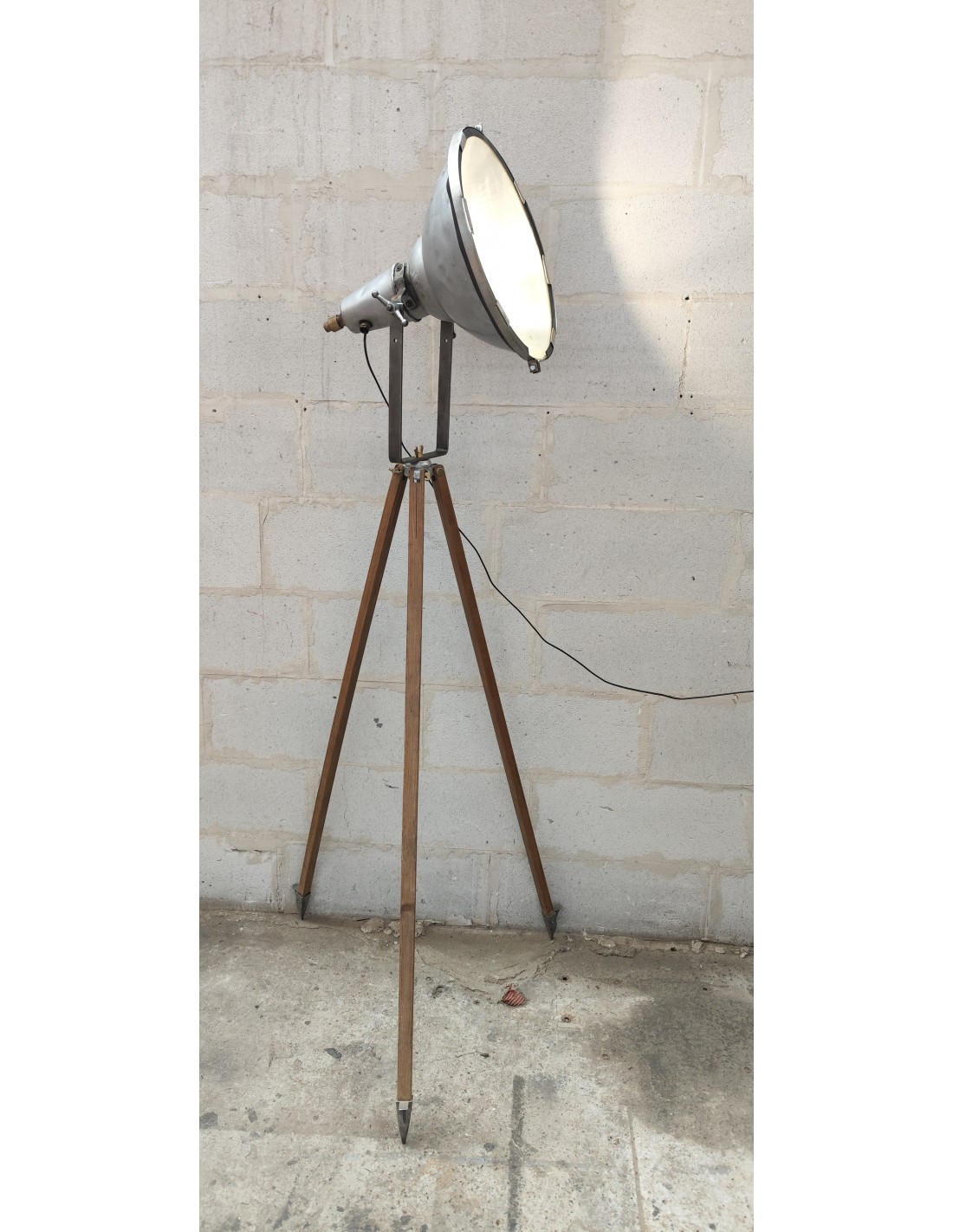 Ancien projecteur Mazda en aluminium posé sur un trépied en bois de géomètre