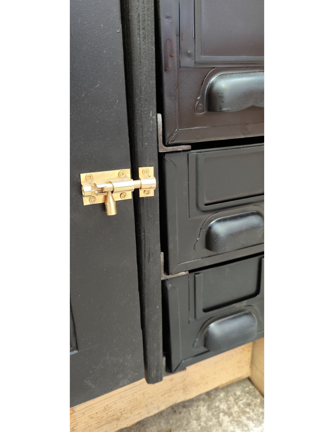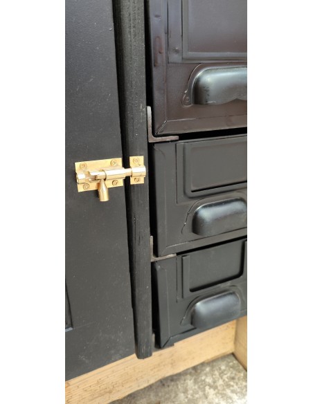 Il est composé d'une porte en bois patine noire avec une jolie plaque en laiton brossé pour la fabrique spéciale de coffres forts Gruson 21 rue Royale à Lille et d'un verrou en laiton , intérieur une étagère de 72cm x 30 cm , et de quatre tiroirs en métal peint en noir de 14.5 cm x 32.5 cm et 12 cm de hauteur