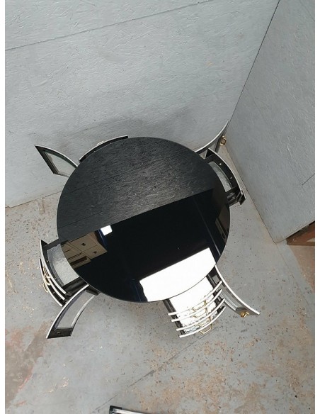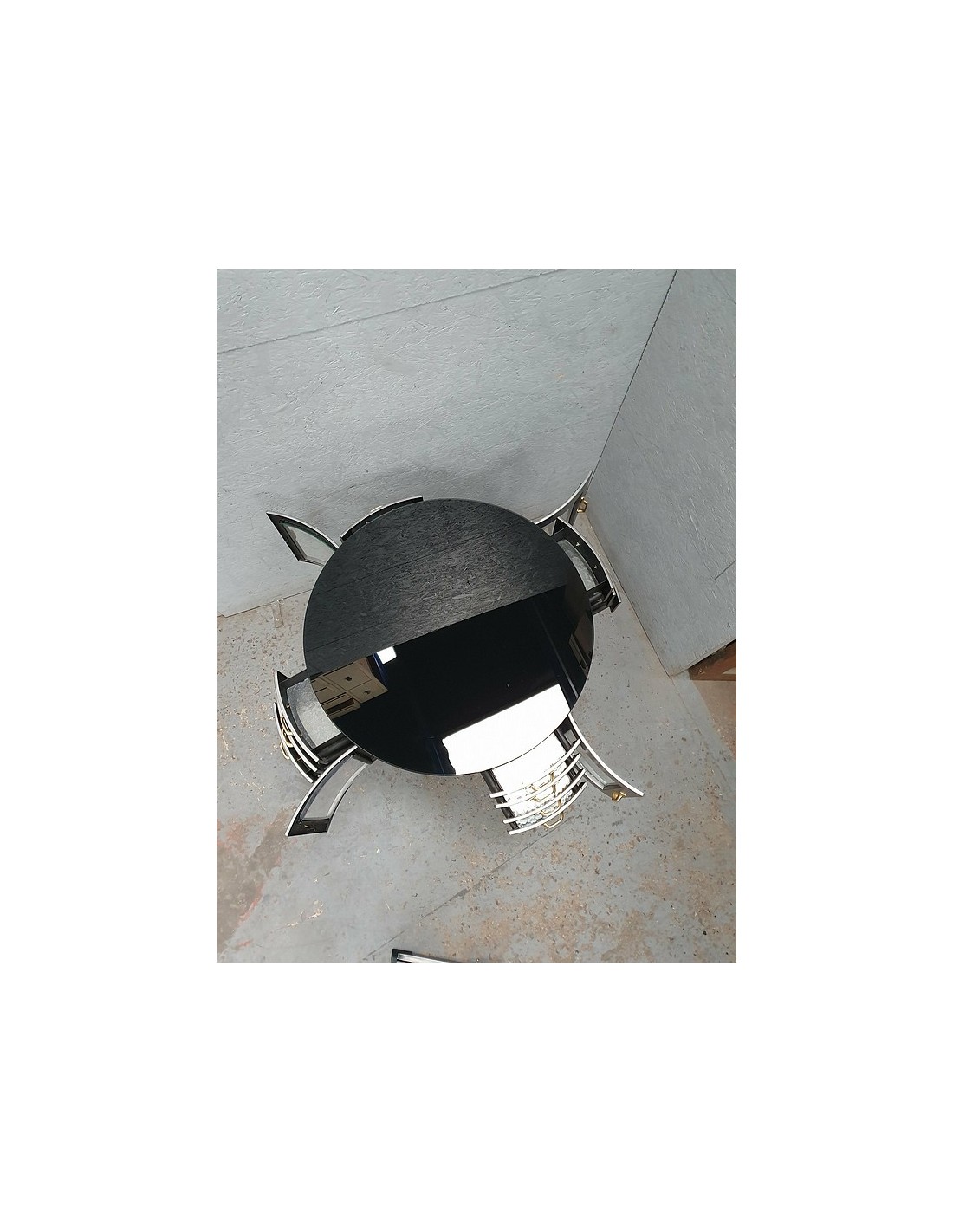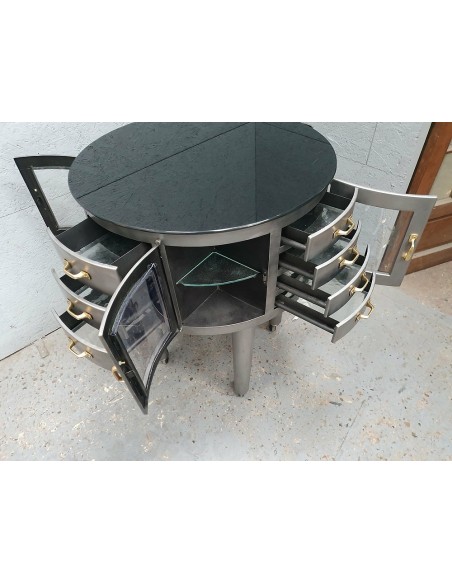 Dessus en verre opalin noir, intérieur repeint en noir et étagères et fond de tiroirs en verre ancien.