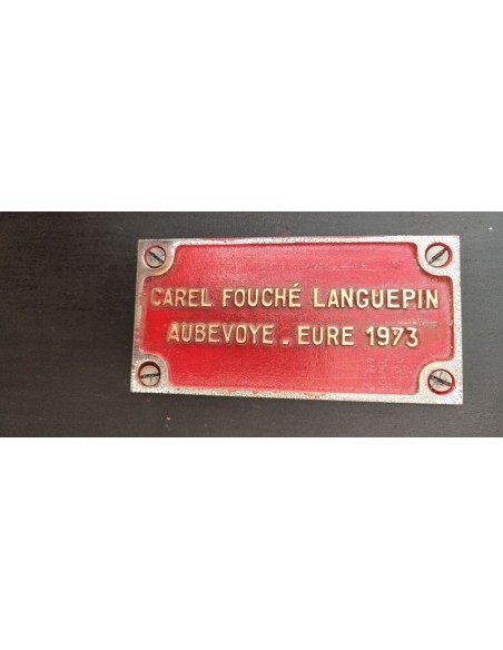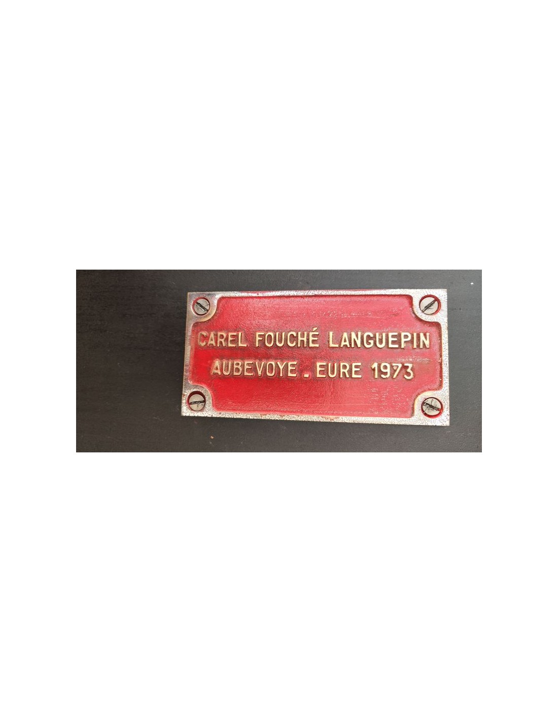 Une porte en chêne peint en noir avec un bouton en métal et une jolie plaque en fonte d'aluminium pour Carel Fouché Languepin Aubervoye Eure 1973