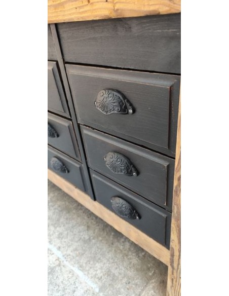 Tiroirs en façade en chêne patine noire et poignées coquille en fonte noire