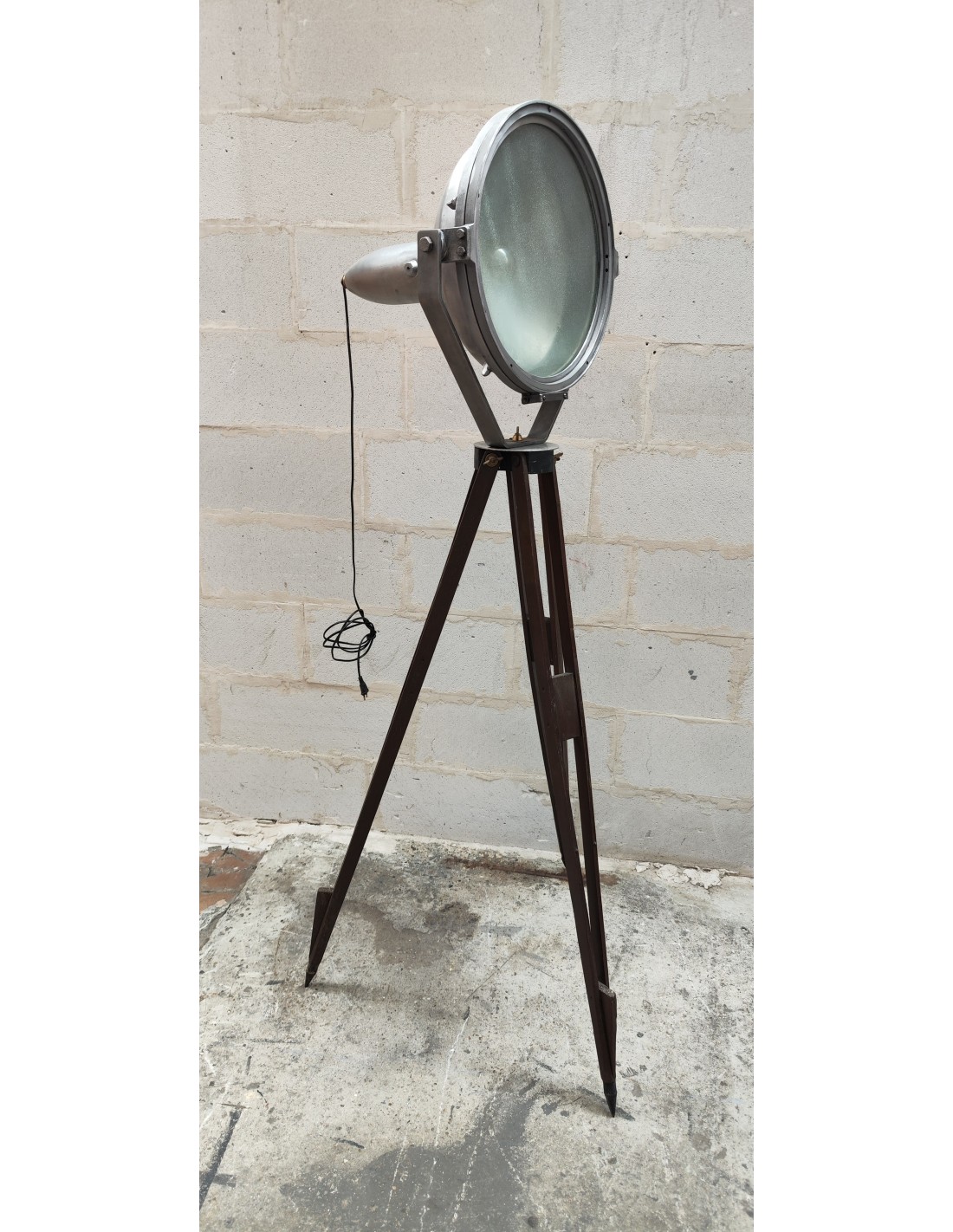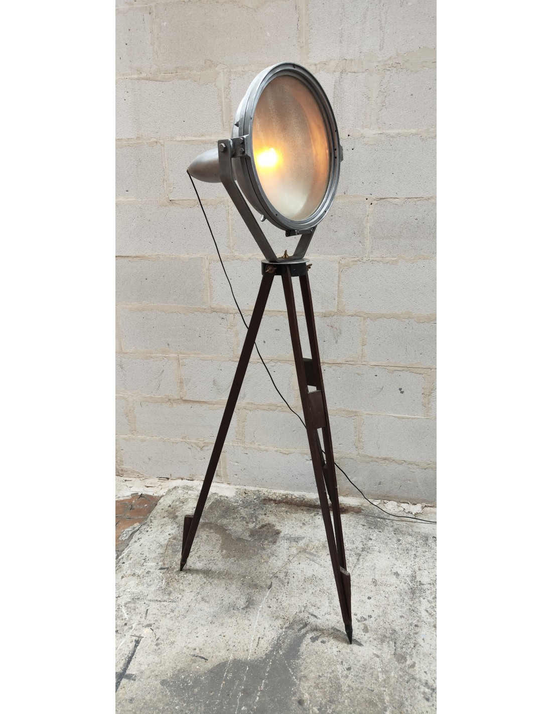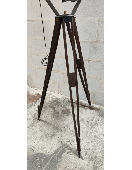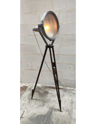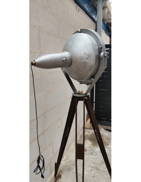 Ancien projecteur industriel sur trépied bois ciré