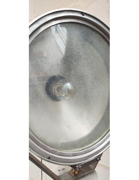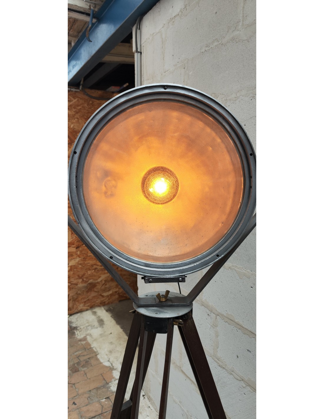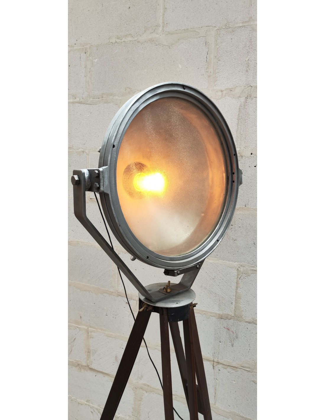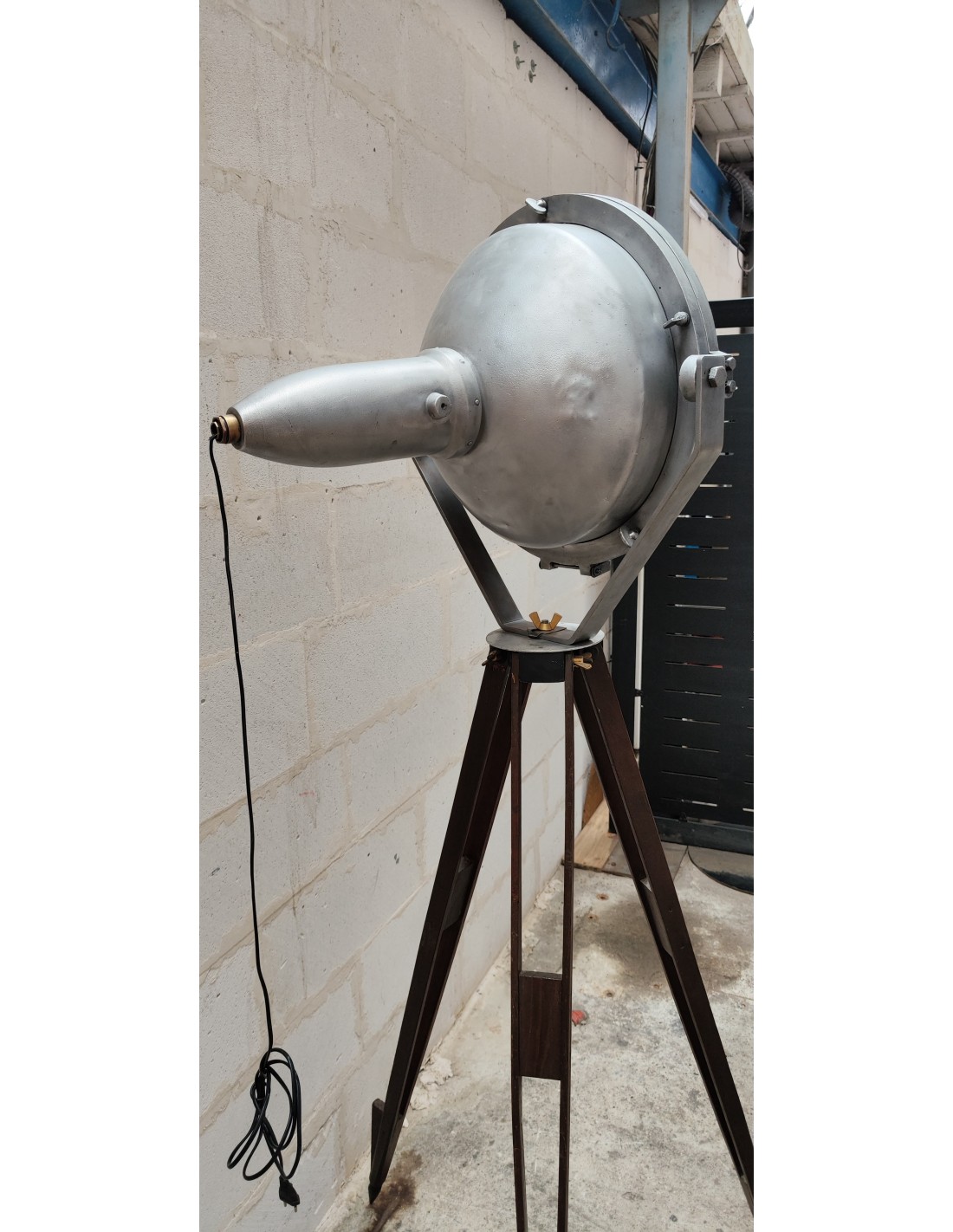 Ancien projecteur industriel sur trépied bois ciré