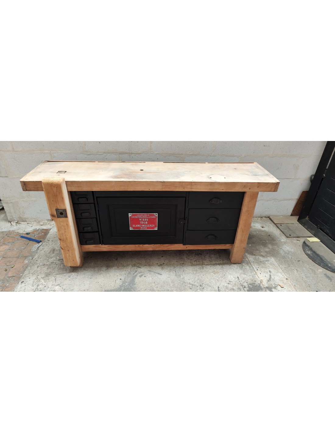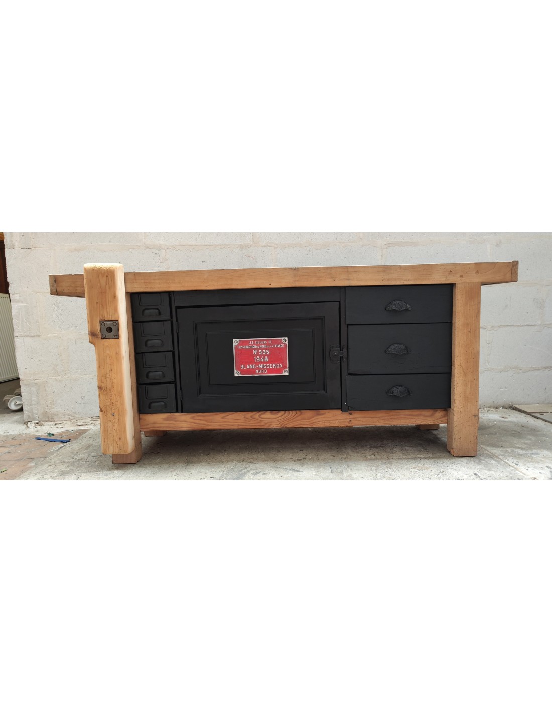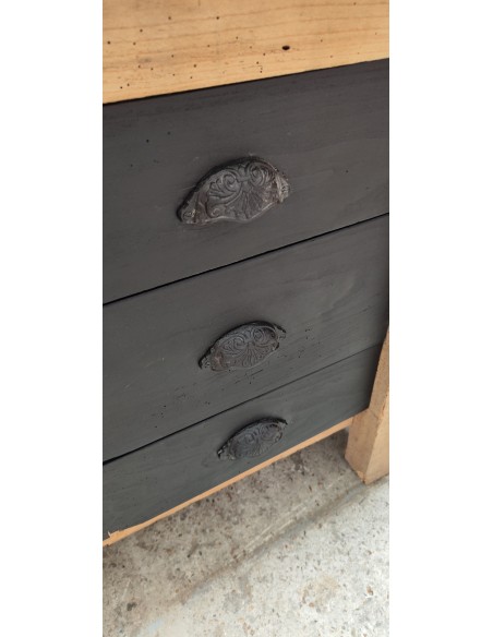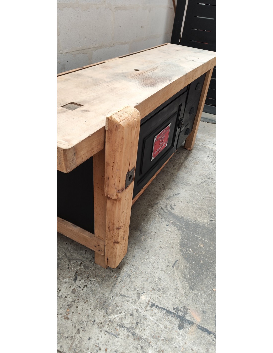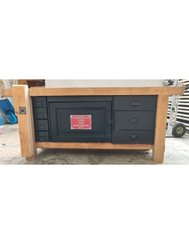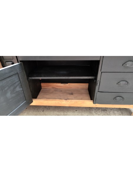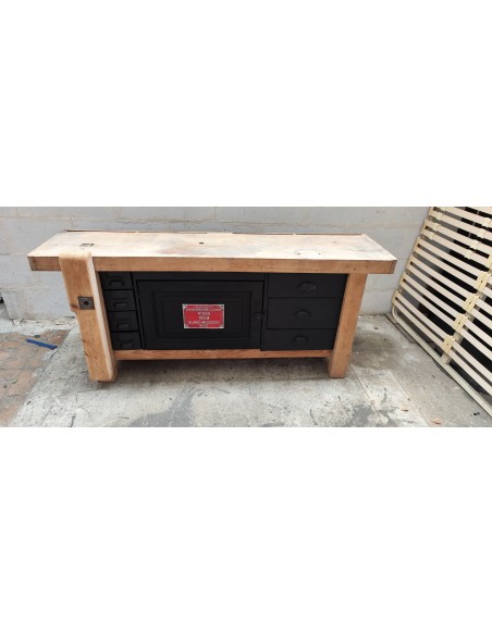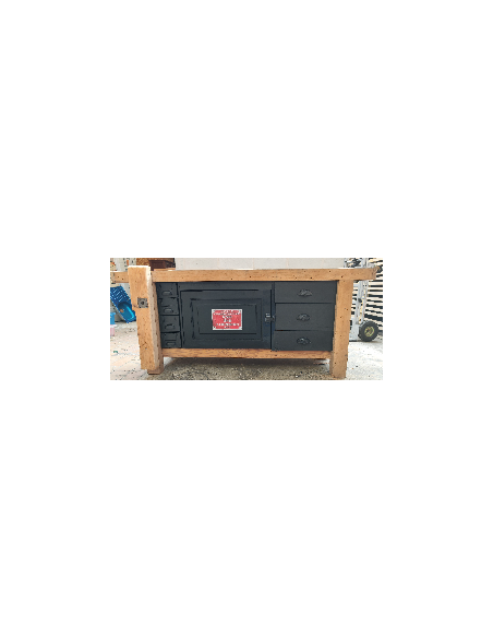 Etabli de menuisier tiroirs et porte patine noire meuble de métier