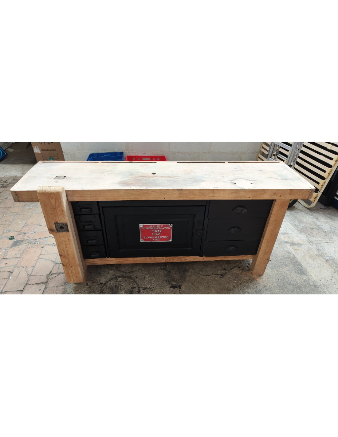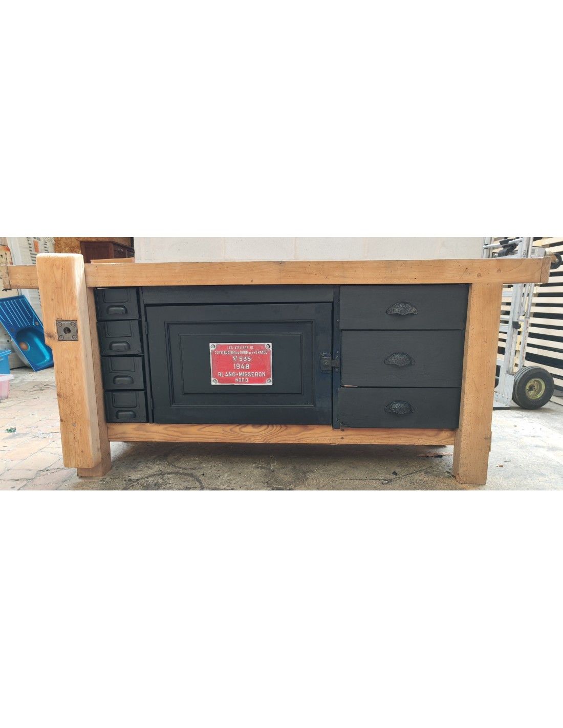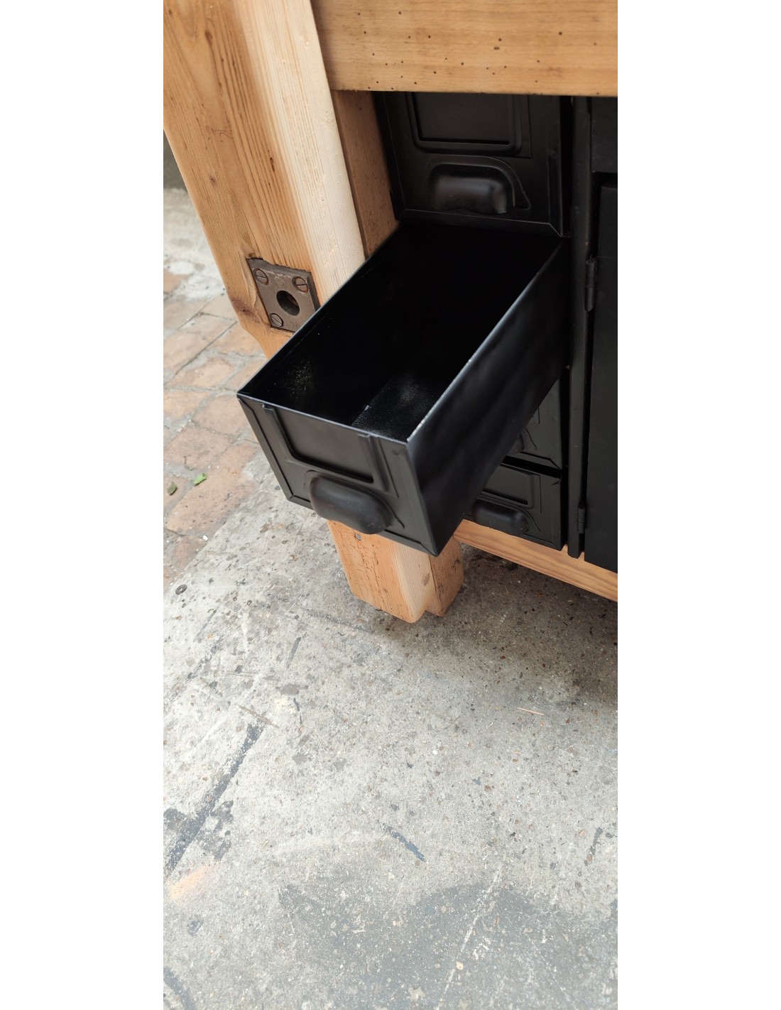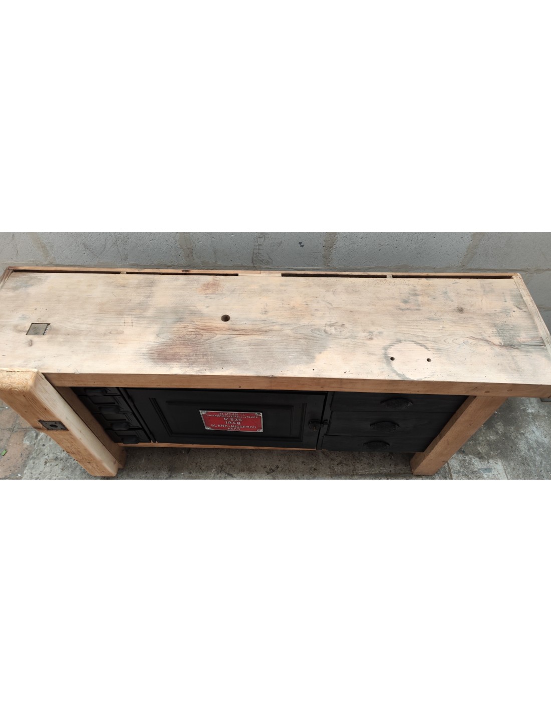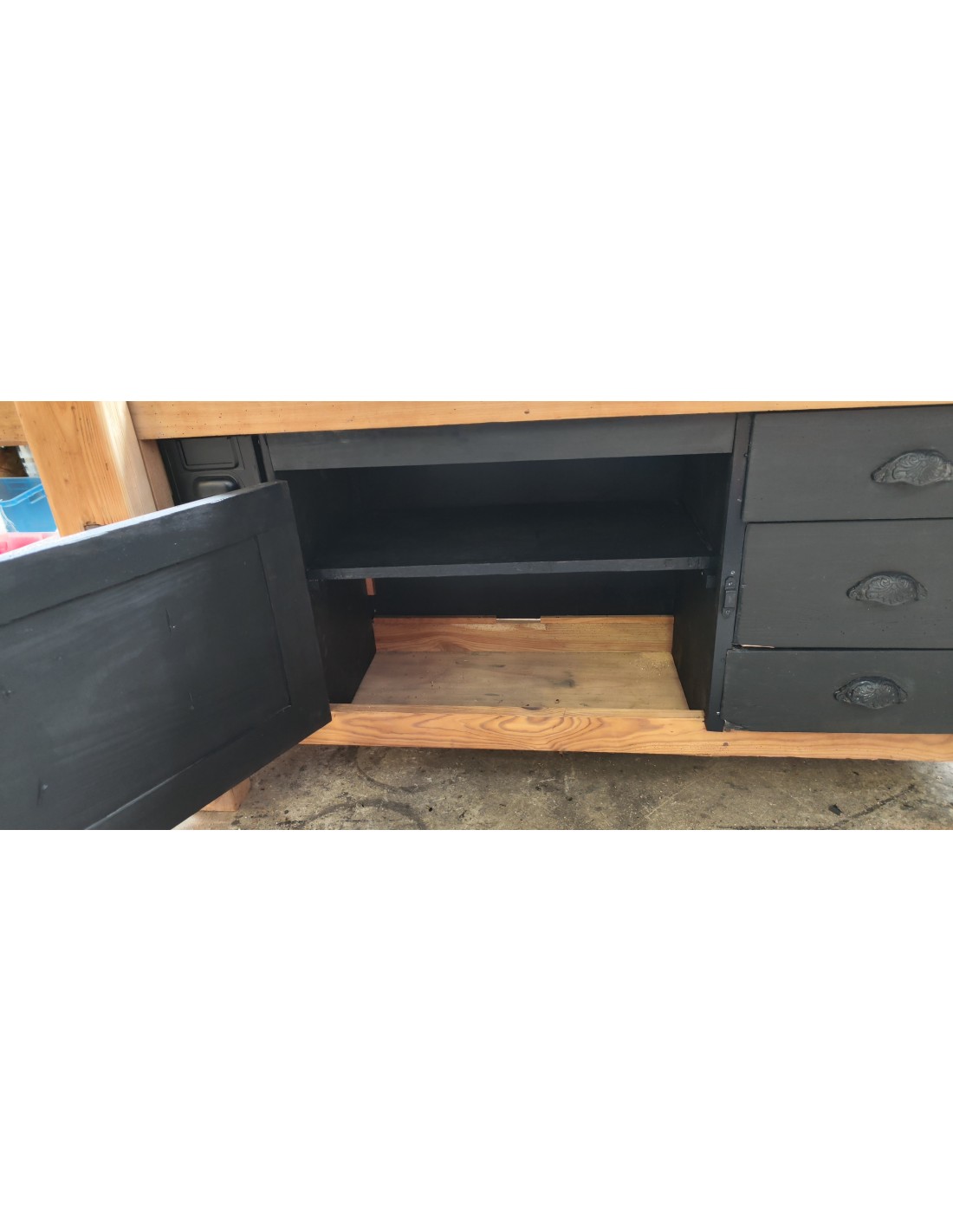 Etabli de menuisier tiroirs et porte patine noire meuble de métier