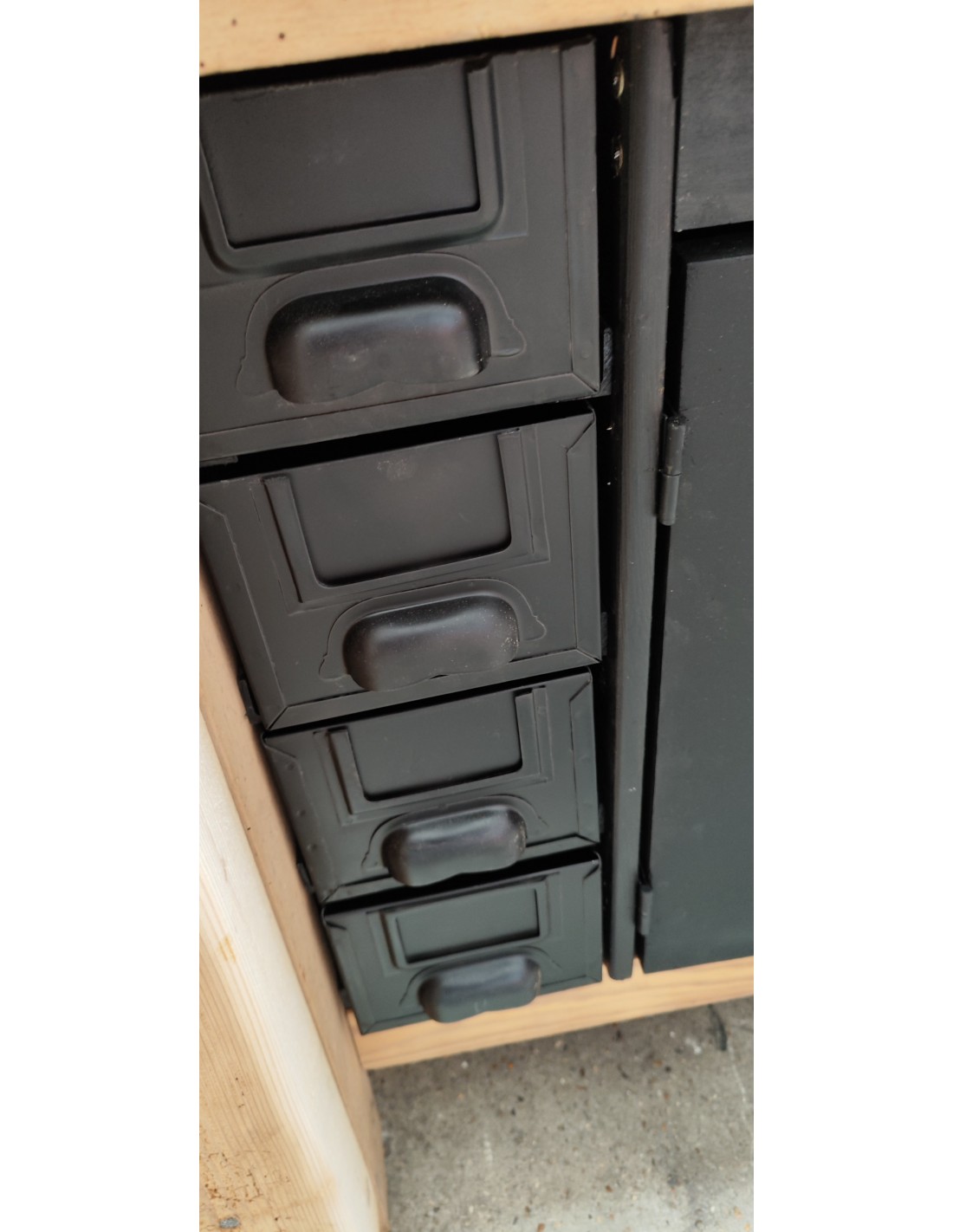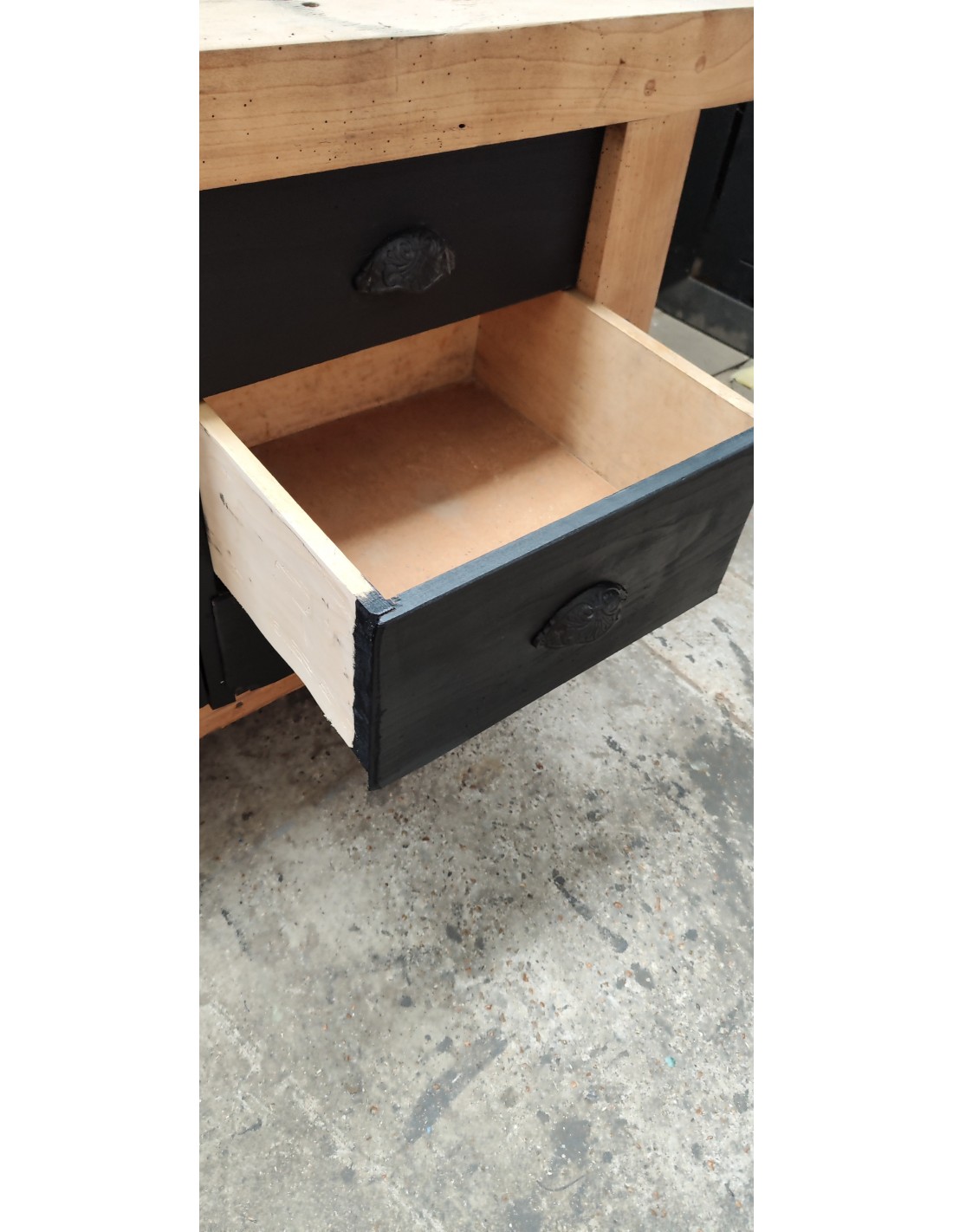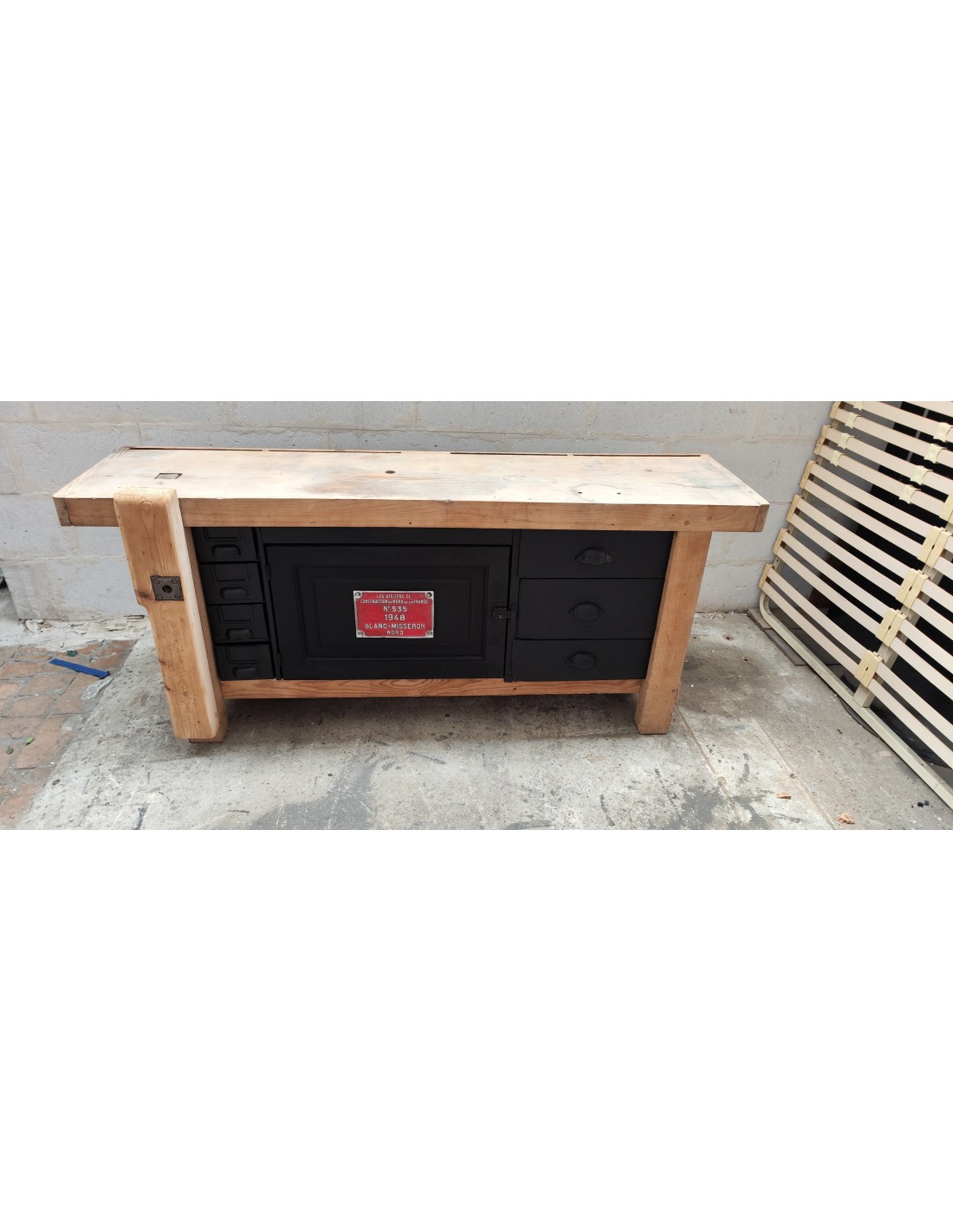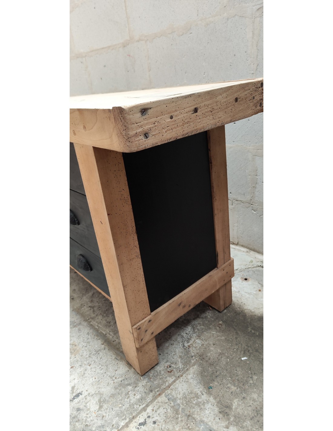 Etabli de menuisier tiroirs et porte patine noire meuble de métier