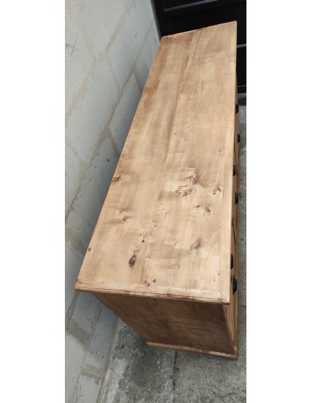 Ce meuble restauré avec soin, présente neuf tiroirs de rangement qui offrent amplement d'espace