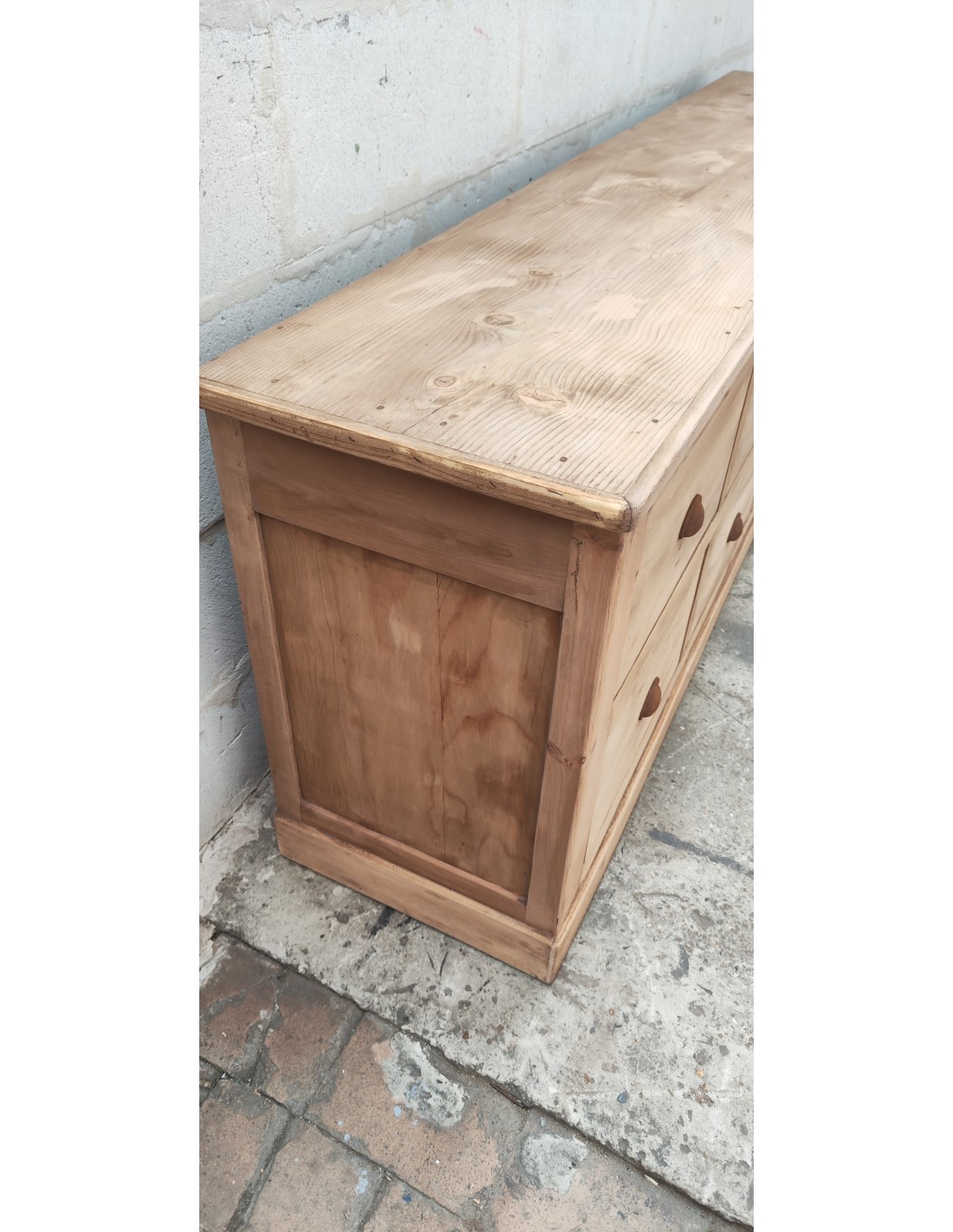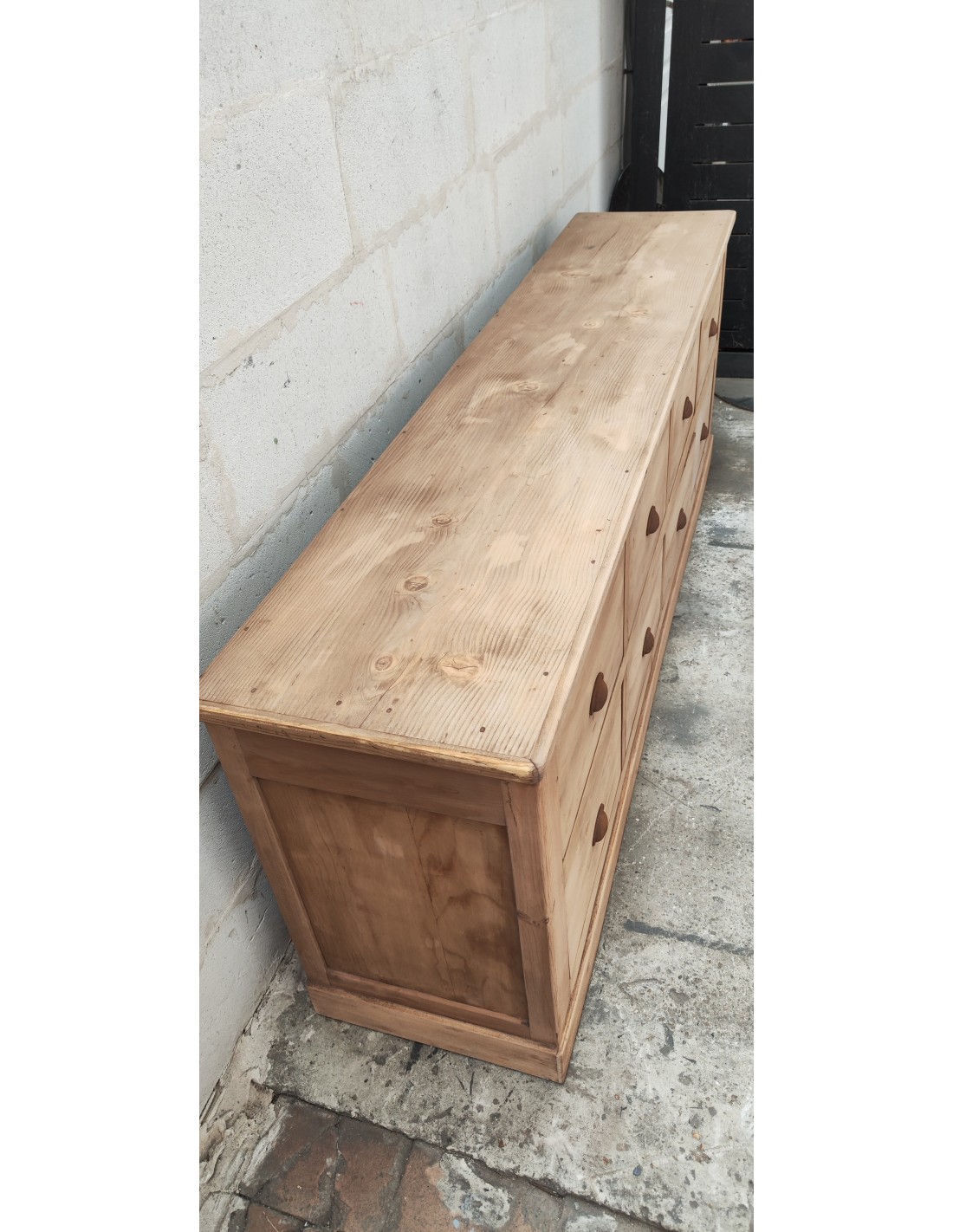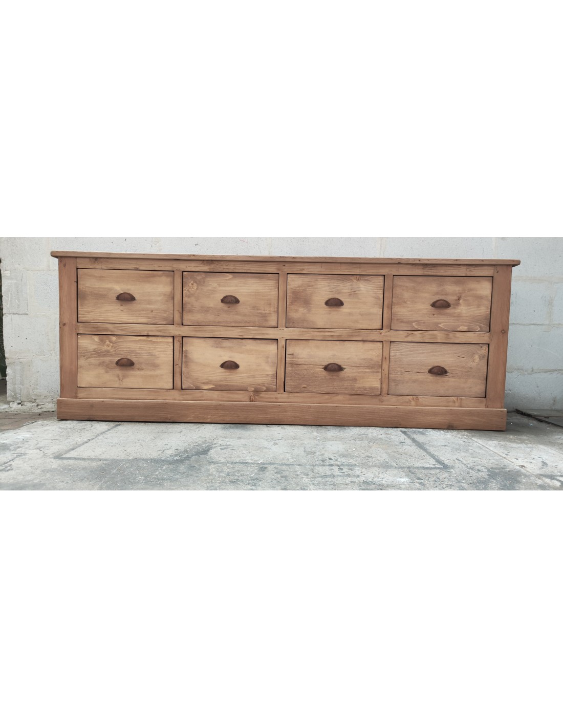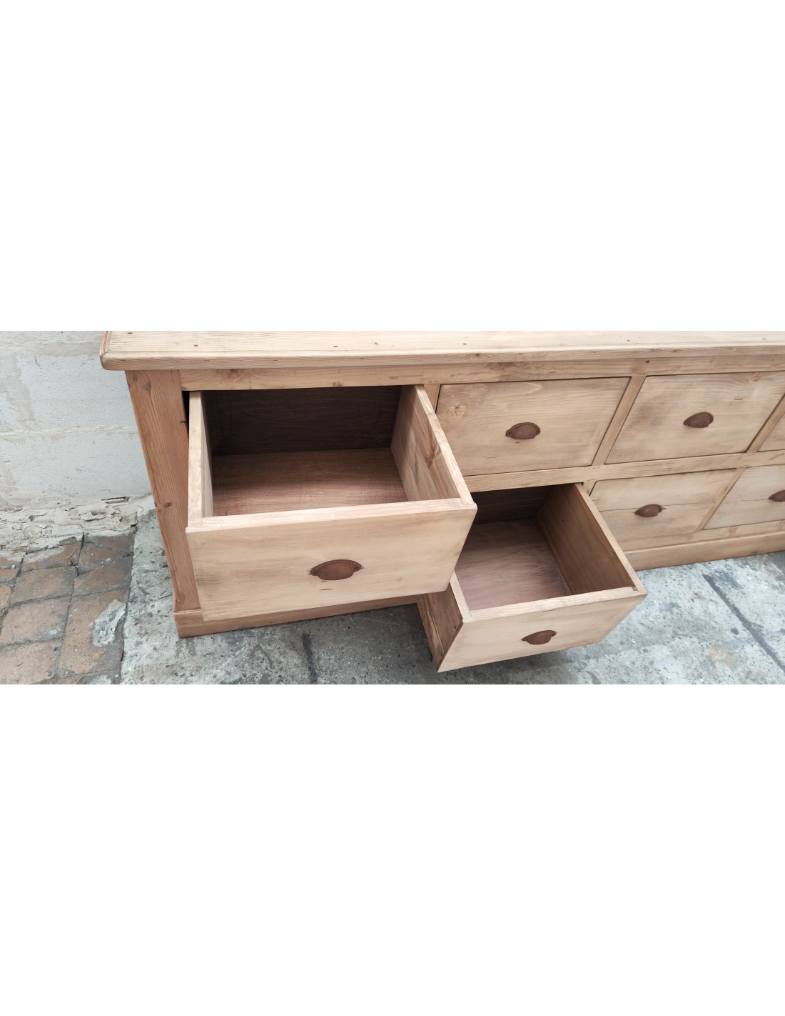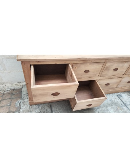 Cet ancien meuble de commerce en bois brut est une petite pepite avec ces huit tiroirs de rangement bien pratique.